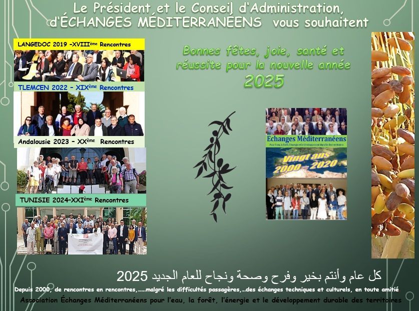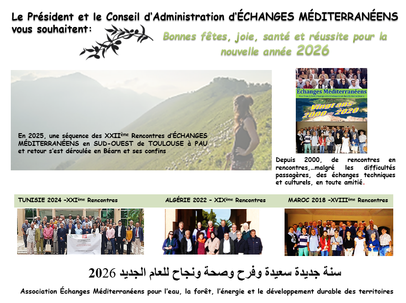 Echanges Méditerranéens, créée en 2000, est une association ouverte aux ingénieurs, universitaires et acteurs des pays de l'ensemble du pourtour méditerranéen. Organisée sur la base des nations (il y a un Vice-président par pays), ses membres et sympathisants ont pour la plupart des responsabilités importantes dans l'aménagement rural et le développement durable de leurs pays respectifs.